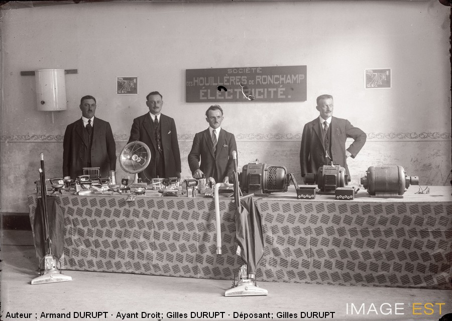 C'est en 1905 que fut décidée la construction d'une usine de production et de distribution d'énergie électrique. Le but était d'abord d'utiliser la quantité toujours croissante des déchets de lavage, combustibles mais non vendables qui ne pouvaient plus être consommés en totalité par les chaudières de la mine. De plus la concurrence étrangère devenait de plus en plus redoutable. D'autre part, des usines d'énergie hydroélectrique étaient en projet dans la région menaçant de réduire encore les débouchés de la Houillère. Les débuts de la Centrale électrique de Ronchamp furent modestes, mais son aménagement fut étudié en vue de rendre possible des développements ultérieurs. Tout d'abord trois turbines à vapeur Zoelly accouplées directement à des alternateurs de 1500 kilowatts furent installées. Deux de ces appareils devaient servir en marche normale. Cela entraîna l'installation à Réchésy, d'une station de réception et de mesure de ce courant et la construction d'une ligne allant de cette station à celle de Belfort où devait s'opérer l'abaissement du voltage de 55.000 à 30. 000 volts. La guerre de 1914 survint au moment où la société suisse commençait les livraisons. Après l'armistice, la marche du service électrique prit un nouvel essor, de nouvelles quantités d'énergie hydro-électrique furent nécessaires, exigeant comme contre partie le développement de la Centrale à vapeur pour assurer la sécurité de la distribution. L'installation d'un alternateur de 6000 kW de puissance fut décidée et le projet étudié en vue de permettre facilement et ultérieurement l'installation d'une nouvelle unité de puissance au moins égale. En 1924 après l'achèvement des travaux en cours le Service électrique de Ronchamp comprendra les installations suivantes: une salle des machines desservie par un pont roulant électrique et contenant: - 3 turboalternateurs de 1500 kW - 1 turboalternateur de 3000 kW - 1 turboalternateur de 6000 kW un bâtiment pour la transformation, la distribution et le contrôle du courant produit par les alternateurs: le hall des chaudières avec: - 4 batteries de 5 chaudières qui évacuent leurs fumées dans deux cheminées de 50 mètres de hauteur. Les feeders de départ constituent les grandes artères de la distribution de l'énergie; ils comprennent principalement en dehors du feeder d'arrivée à 55.000 volts, les lignes à 30.000 volts sur Giromagny, Belfort, Plancher-les-Mines et Plancher-Bas, Lure, Remiremont, Le Thillot, etc., plusieurs établis en double ou en boucle, et se soudant à des lignes de transports de Sociétés électriques voisines. Tous ces feeders sont en cuivre électrolytique et sont supportés par des pylônes métalliques. Les sous stations de transformation reçoivent le courant amené par les feeders, où on le ramène en grande partie à 5000 volts pour être distribué ainsi aux gros consommateurs ou être envoyé aux cabines de distribution qui le répartissent après l'avoir transformé en 240 volts. Ces sous-stations de transformation sont établies â Belfort, Frahier, Giromagny, Plancher-Bas et Plancher-les-Mines, Lure, Luxeuil, Fougerolles, Val d'Ajol, Le Thillot, Plombières, etc... En aout 1927, la société des Houillères de Ronchamp tenait un stand au Val-d'Ajol à l'occasion de la Fête de la Société d'agriculture et du Comice agricole de l'arrondissement de Remiremont. La société présentait du matériel fonctionnant à l'électricité dont des moteurs, des fers à repasser, des plaques chauffantes, des aspirateurs, etc... Le nombre des localités désservies est de 62. Le nombre de clients est au total de 5500 pour l'éclairage et de 650 pour la force motrice représentant une puissance de 17.245 kilowatts exigeant un nombre de transformateurs de 250 et 3500 compteurs environ. Le réseau est formé de 60 km. de lignes à 55.000 volts, 240 km. de lignes à 30.000 volts, 200 km. de lignes à 5.000 volts, 100 km. de lignes à basse tension, soit au total environ 600 kilomètres de lignes et la production de courant a été de 22 à 37.000.000 KW par an jusqu'en 1950. |